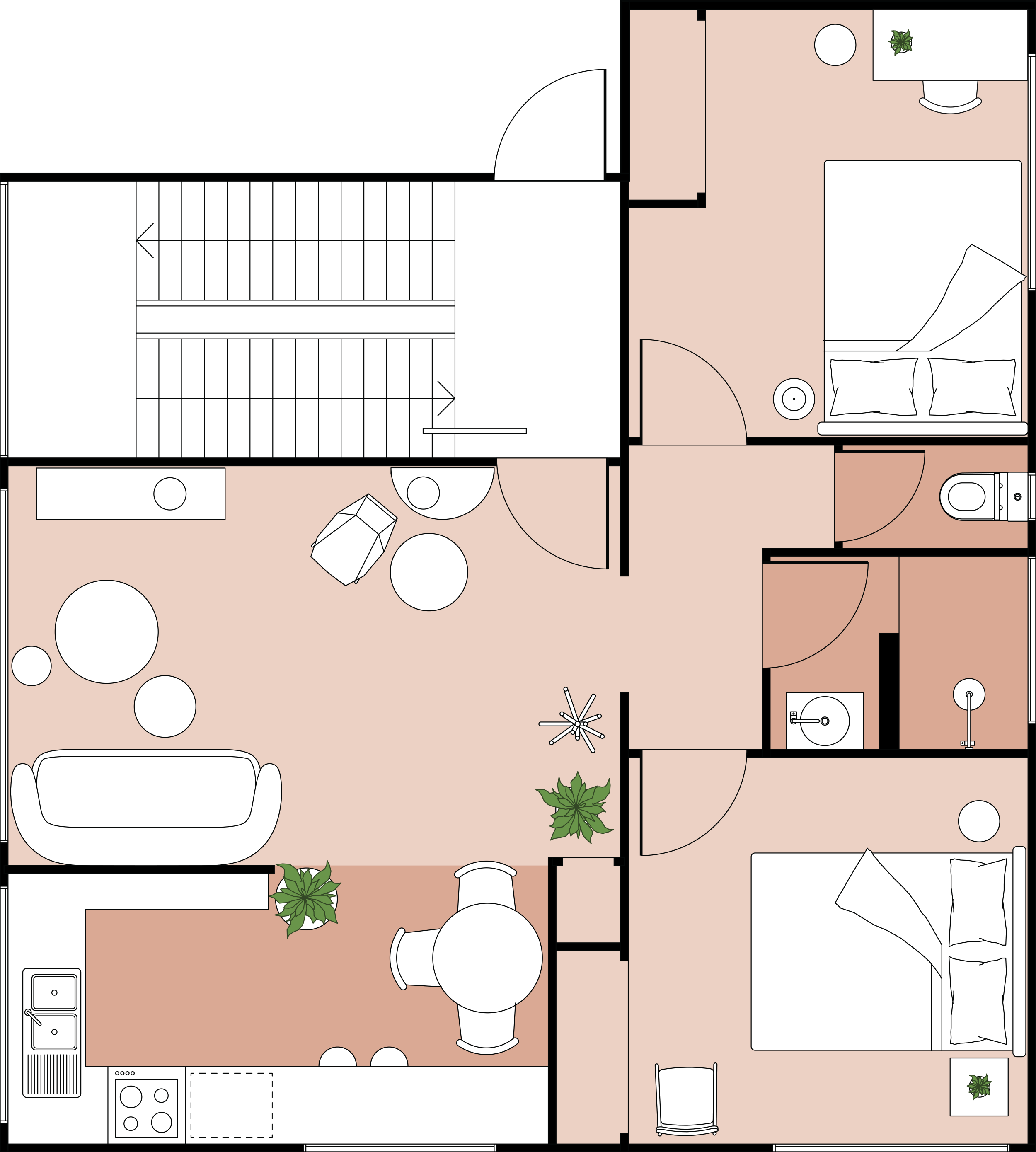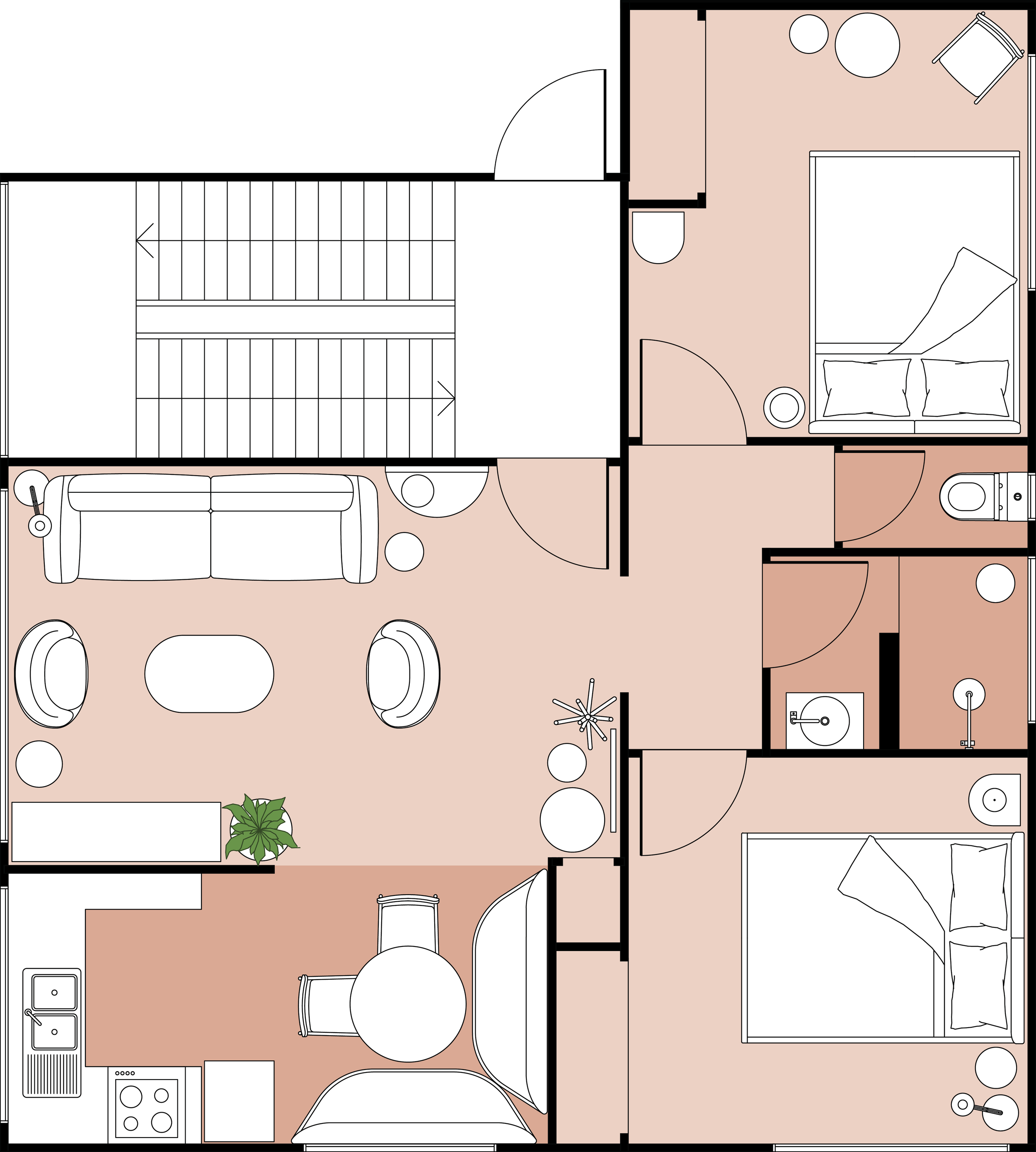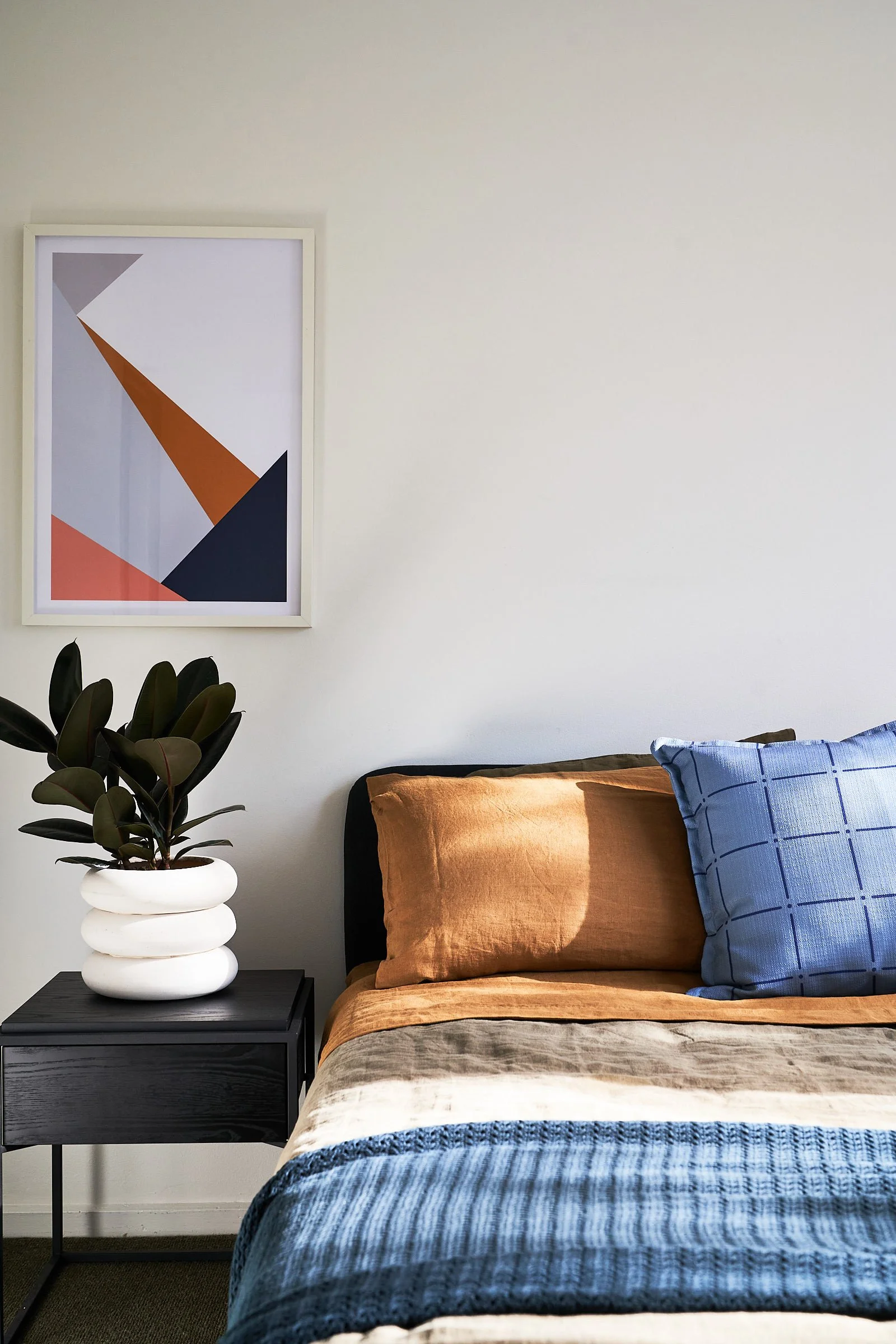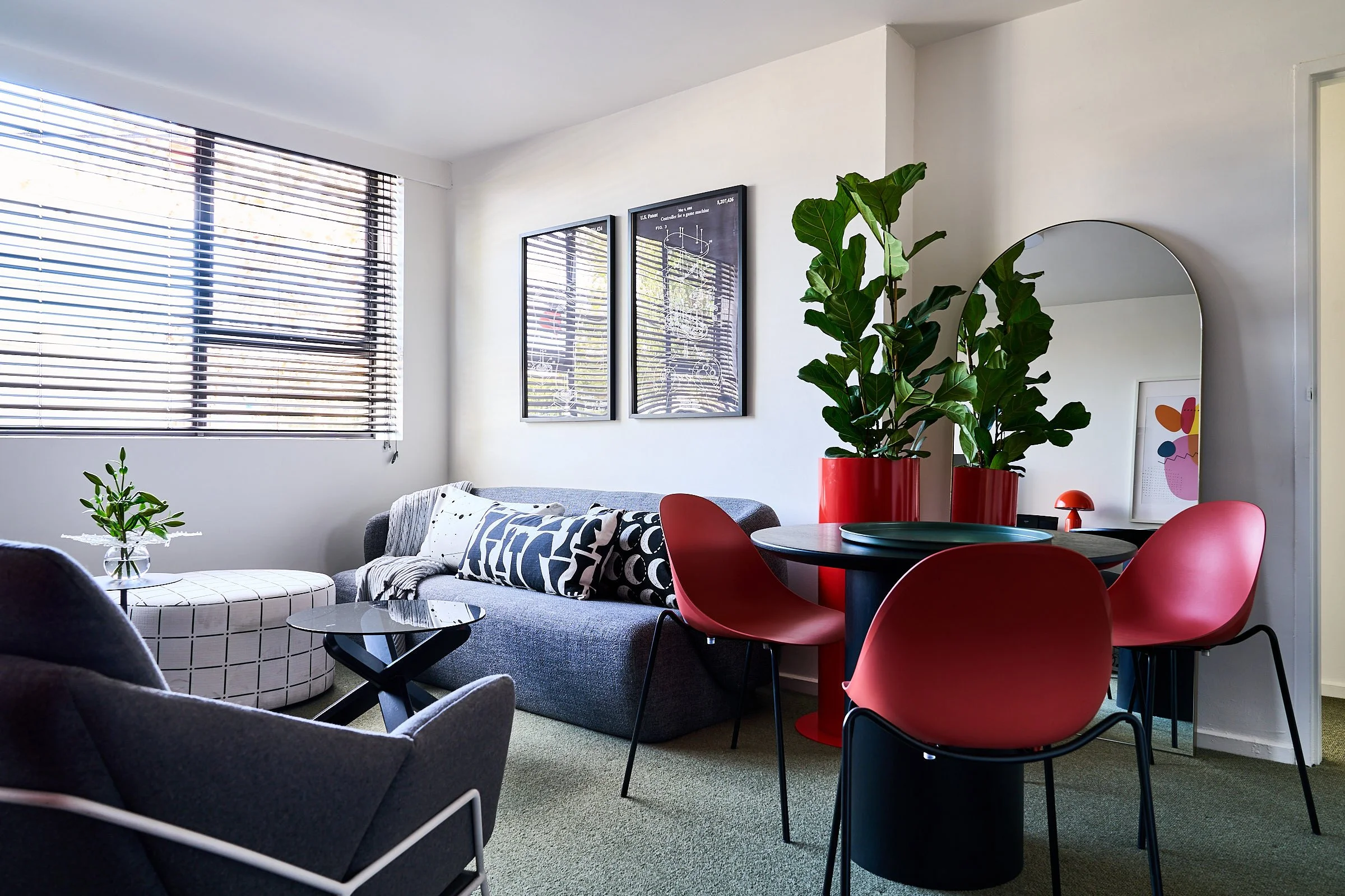 Relax in your 2-bedroom pad fitted out by Move-in, featuring our fabulous custom-made furniture and fabrics from The Super-Graphic Collection created in collaboration with Lisa Gorman.